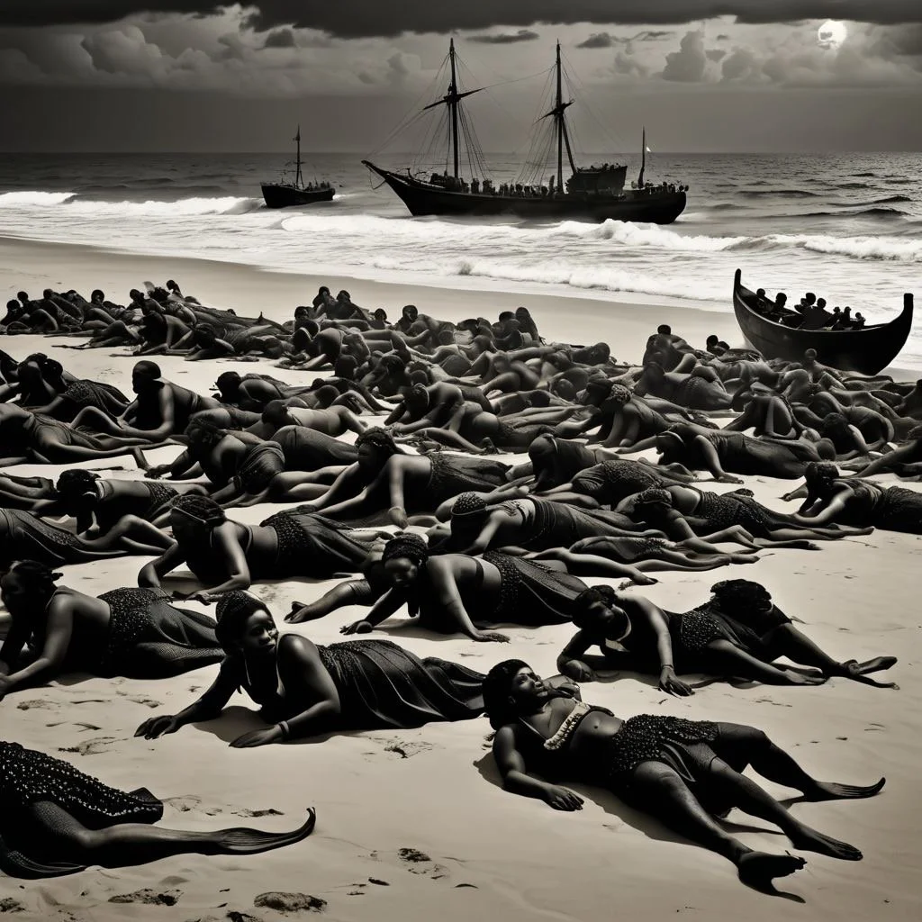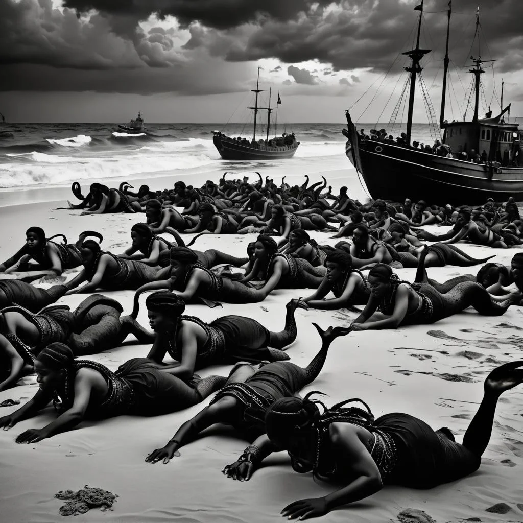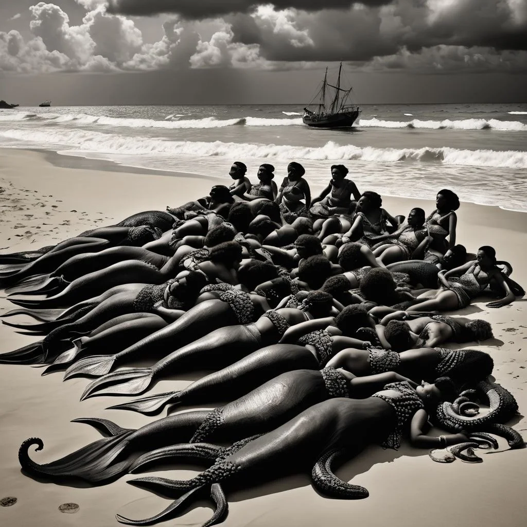 This series is inspired by the histories of African women in the Brazilian coasts who engineered forms of protest and anti-colonial black liberation. The women used botanical plants as forms of weapons to protect their ecosystems and maintain their cultural heritage. Combining the mythological stories of Drexyan underground mermaids (the transformation of murdered enslaved populations thrown at sea during the Slave Trade into underwater mermaids), the women water spirits live at sea and on land as the protectors of living ecosystems.