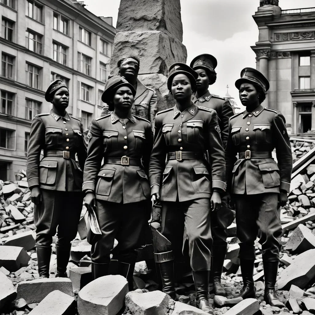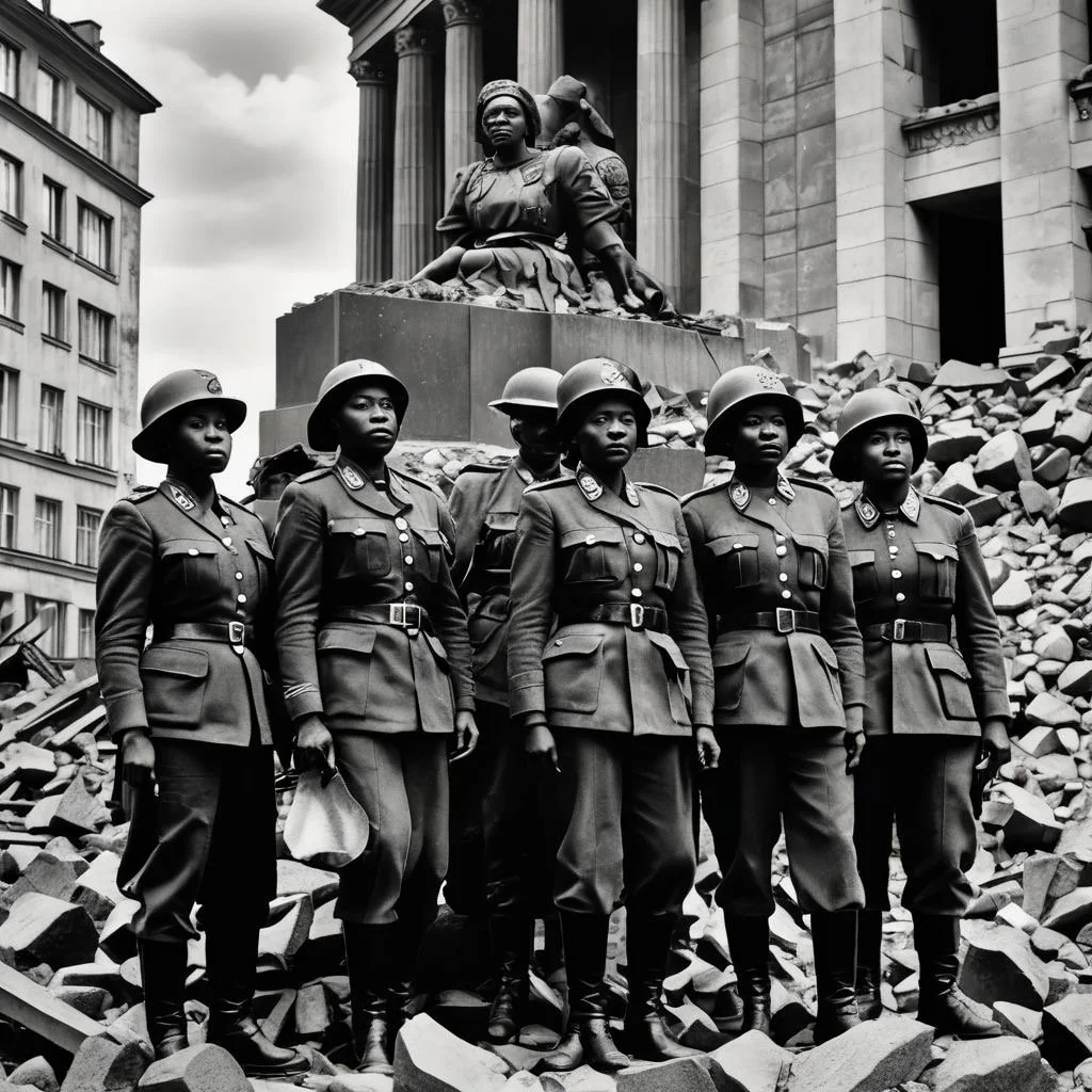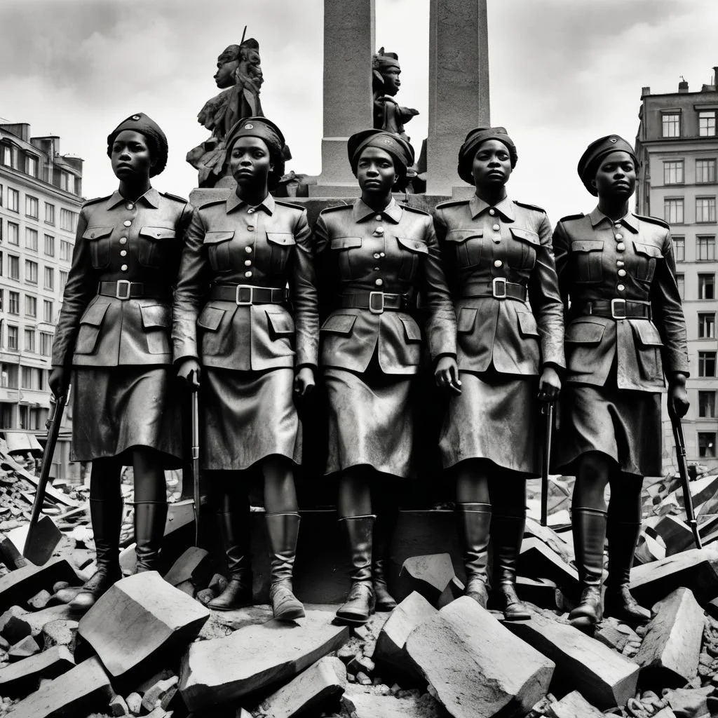 The series transforms original 20th century archive war photos and film between the French, British and American female troops notably at the end of WWII and the reconstruction of Berlin city. The artist re-imagines through drawing, painting, photographs and AI scripting, how Berlin’s city rubble called “Trümmerberg” would build African monuments around the city, turning mounds around the city as points of visibility and accountability rather than generational trauma through disappearance and denial.