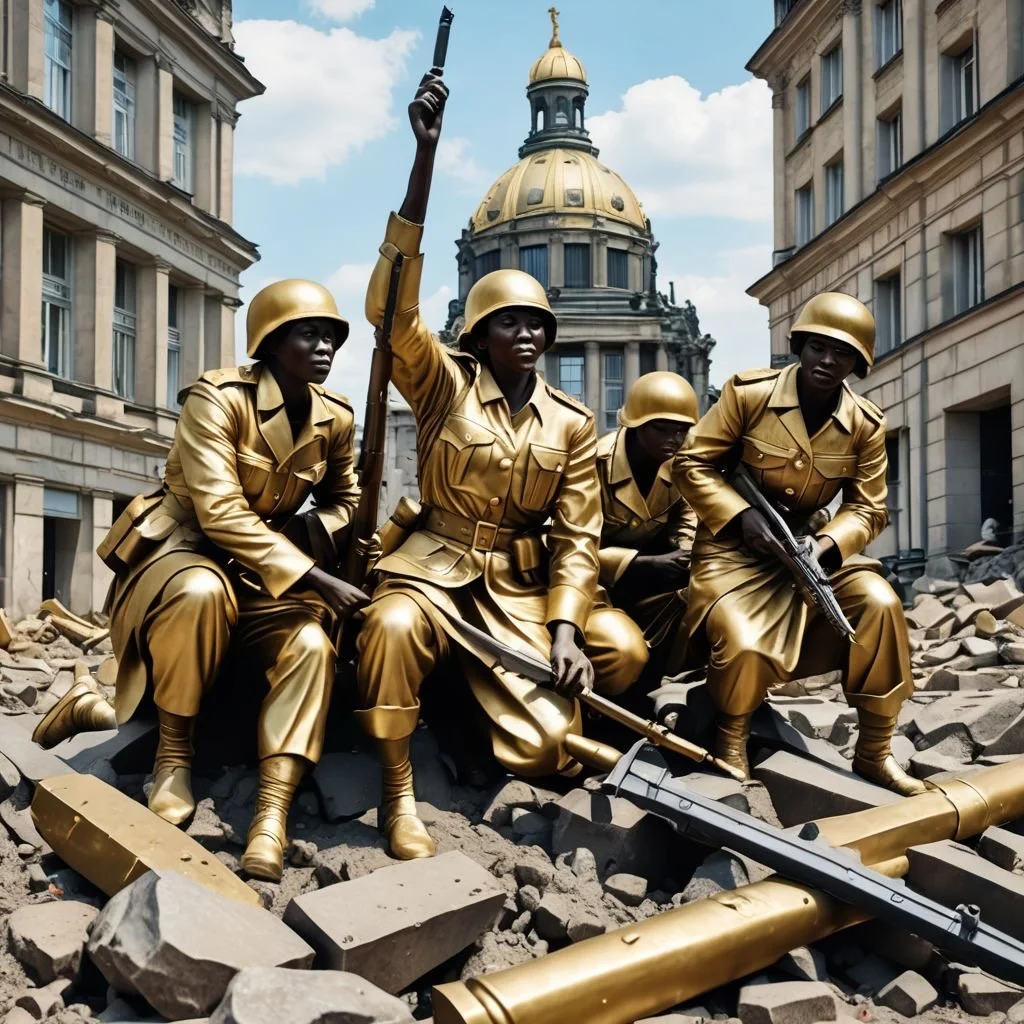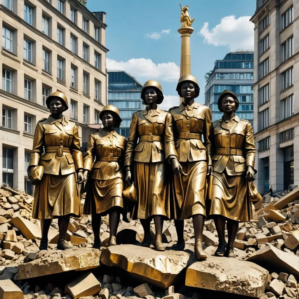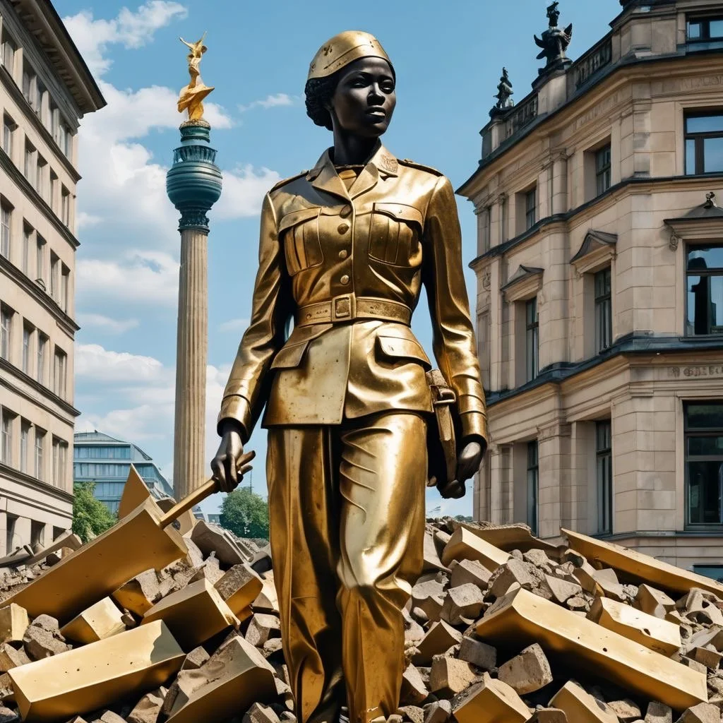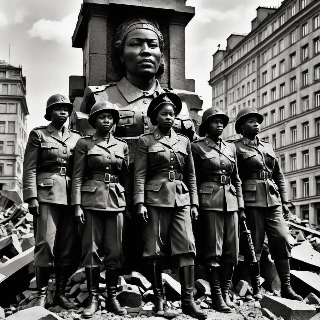 The series transforms original 20th century archive war photos and film between the French, British and American female troops notably at the end of WWII and the reconstruction of Berlin city. The artist re-imagines through drawing, painting, photographs and AI scripting, how Berlin’s city rubble called “Trümmerberg” would build African monuments around the city, turning mounds around the city as points of visibility and accountability rather than generational trauma through disappearance and denial.
